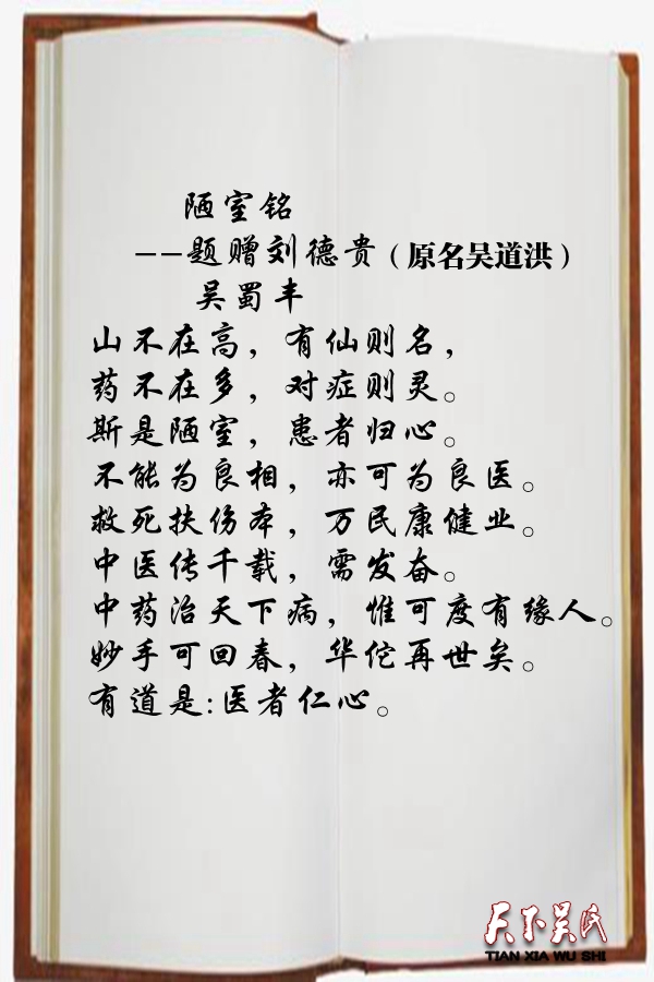 他曾经拥有多重身份,从医生到教师,从企业家再到学校校长。他11岁跟随父亲上山学采草药,17岁当赤脚医生,22岁当乡卫生院院长,38岁因公至残失去了右腿,44岁创立残疾人贸易总部会员人数达到18000多人。解决了400多名残疾人就业,45岁创办医院对残疾人五保户全免费治疗,59岁创办二所小学,让残疾人学生免费入学,他医治过的患者近百万人,相当于一个小县城的总人口数量,他将无数个病危者从死亡线上拉回来,他永远是吴氏宗亲学习的楷模,已有五个子女子承父业继续传承中医,不幸的是吴道洪宗长已永垂不朽享年74岁。