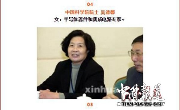 吴德馨,女。半导体器件专家。河北乐亭人。1961年毕业地清华大学无线电电子学系。中国科学院微电子中心主任、研究员。作为主要负责人之一,在国内首先研制成功硅平面型NPN高速开关晶体管,所提出的提高开关速度的方案被广泛采用。在介质隔离数字集成电路和高阻抗运算放大器线性电路的研制中,解决了许多关键问题,研制成功N沟MOS4K位动态随机存贮器,在国内首先将正性胶光刻和干法刻蚀等用于大规模集成电路的研制,并进行了提高成品率研究,打破了中国大规模集成电路成品率低的局面;研制成功16K位和64K位动态随机存贮器,开发成功双层多晶硅和差值氧化工艺,独创了检测腐蚀接解孔质量的露点法;研制成功多种专用集成电路和VDMOS系列功率场效应器件。1991年当选为中国科学院院士。