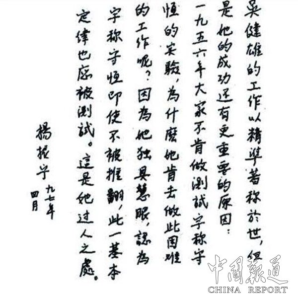 吴健雄为世界顶尖的女性实验物理学家,她的意志力和对工作的投身,使人联想到居里夫人,但是她更加的入世、优雅和聪慧。(诺贝尔奖得主赛格瑞评)