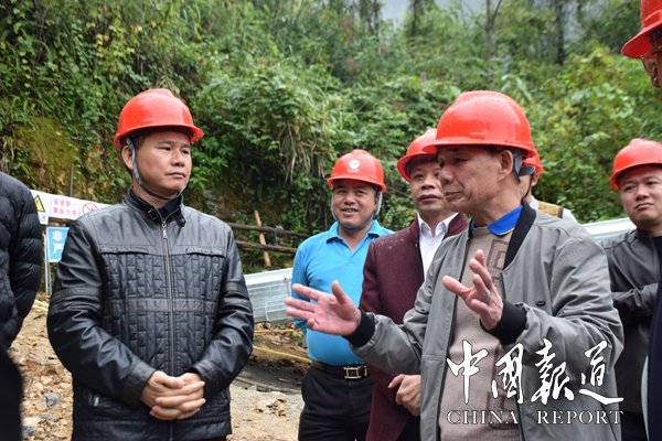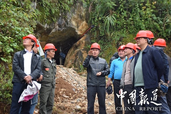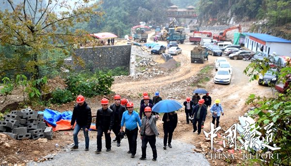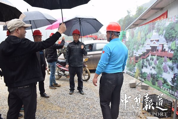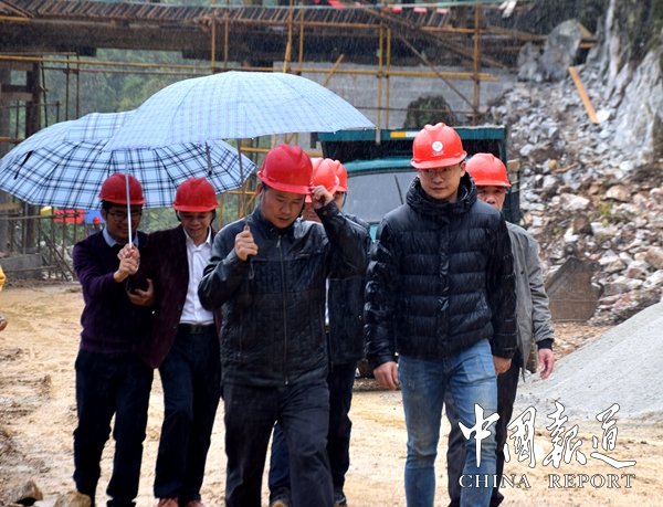 中国报道讯(吴蜀丰通讯员覃源岑福山)11月17日上午,冬雨绵绵,道路泥泞,中共东兰县委书记黄贤昌、县人大常委会主任覃晗胜及县直有关部门领导冒雨专程来到长乐镇板登村广西第一湾股份公司旗下旳长乐宫景区进行项目开发调研和检查项目进度及安全生产。