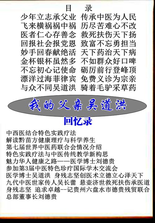 贵州智燊健康管理有限公司 贵州黔心苗健方健康管理有限公司 六盘水黔苗方康养中心吴恒最后表示,继承父亲的遗训(人存良心天照看。真材实料,饿死也不坑害人),将中医发扬光大!目前我父亲的补肾壮阳酒即将投产,以及《我的父亲吴道洪》回忆录由作家吴蜀丰撰写即将出版问世,本书内容浅显易懂,是一本不可多得的励志故事,特别是对从医者将受益匪浅。