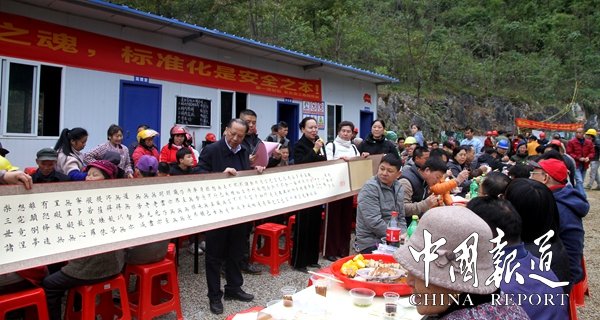 11月28日,考察团成员来到公司正在建设的名胜景区长乐宫时,受到公司和当地干部群众的热烈欢迎,当地群众用壮族迎宾最高规格壮族铜鼓阵欢迎他们的到来,长乐宫景区大门前,铜鼓声、鞭炮声不断,考察团认真了解景区开发规划、目标,还参加公司举行的长乐宫洞口洞门立门仪式,中午,考察组成员一起与公司员工和当地群众共200多人共进当地壮族特色的长桌宴午餐,王淑萍院长代表写经院给第一湾股份公司赠送珍贵的长达6米的经典书法经文。
