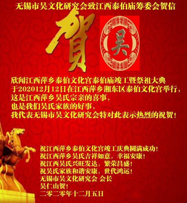 欣闻江西萍乡泰伯文化宫《泰伯庙》竣工暨祭祖大典时间定于2020公历12月12日农历(十月二十八日)星期六在江西萍乡湘东区泰伯文化宫举行,这是江西萍乡吴氏宗亲的喜事,也是我们吴氏家族的好事,我代表无锡市吴文化研究会特对此表示热烈的祝贺!