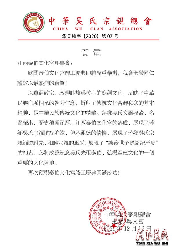 中华吴氏宗亲总会致江西泰伯庙理事会贺电