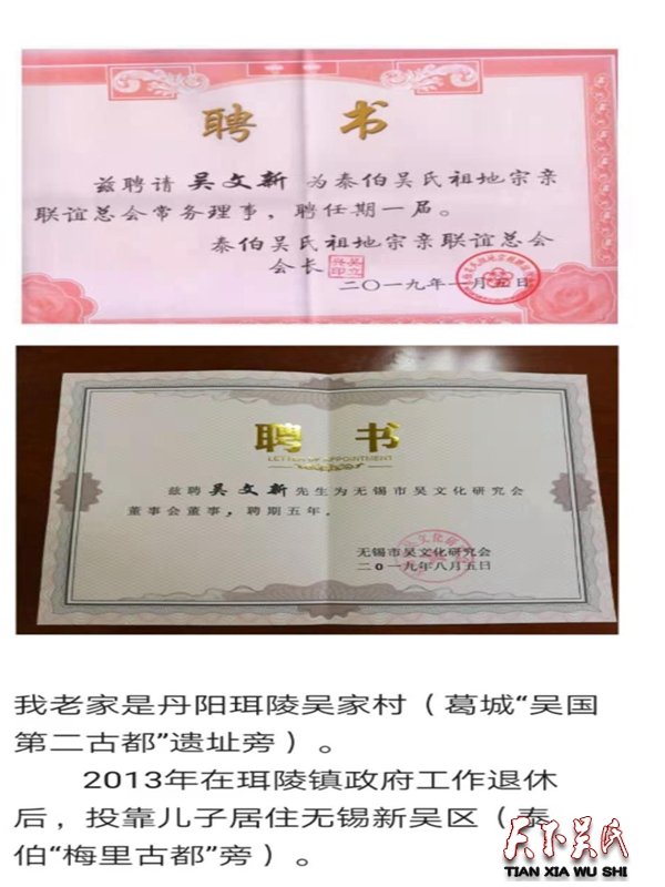 由于生活的改变。我2013年退休后,因儿子在无锡,我也随儿子将户籍迁到了无锡,现也居住在无锡新区。我是无锡人,也是丹阳人。2016年上半年起,我就积极热情的,参加无锡吴文化节和吴氏宗亲联谊活动,去年十月,被正式聘任为泰伯租地吴氏宗亲联谊会理事,我感到非常荣幸。既加深了与吴氏宗亲的感情,又增进了对吴文化研究的热情。