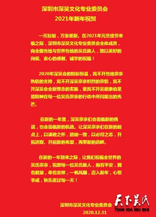 一元复始,万象更新。在2021年元旦佳节来临之际,深圳市深吴文化专业委员会全体成员,向全国各地与世界各地的吴氏族人,致以美好的问候、衷心的感谢、诚挚的祝福I