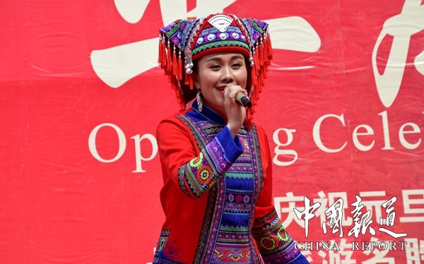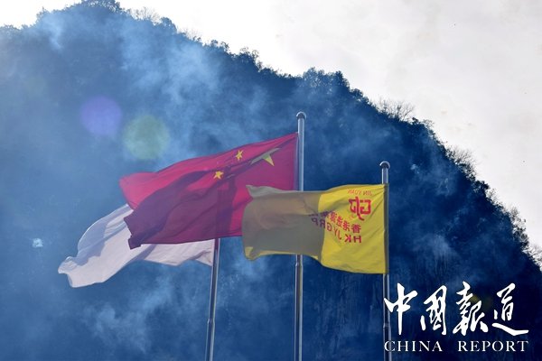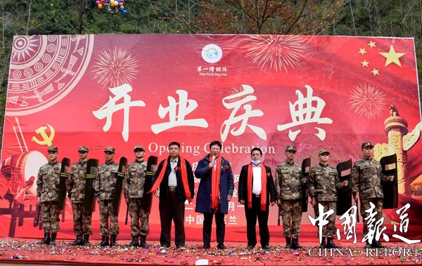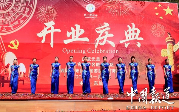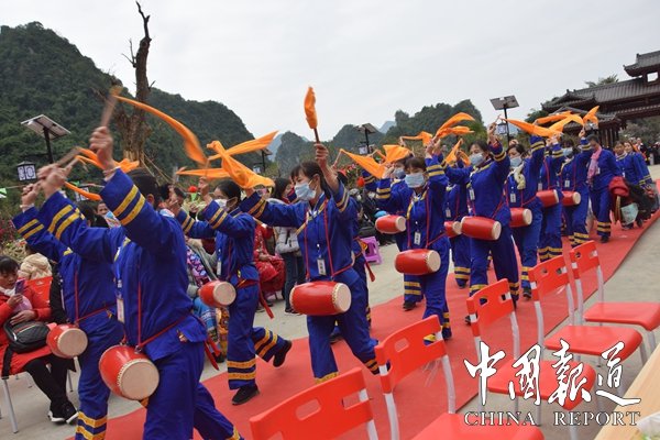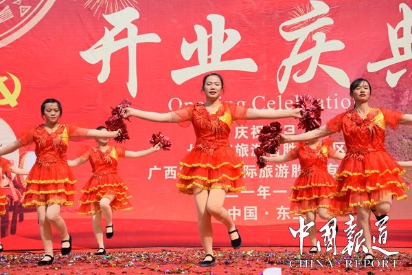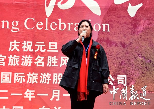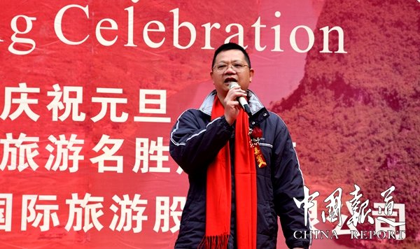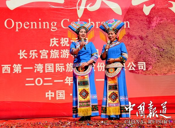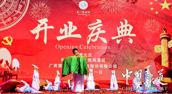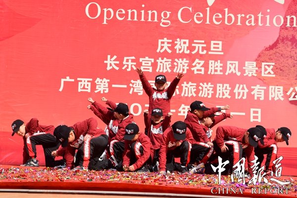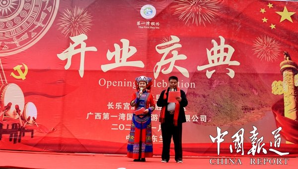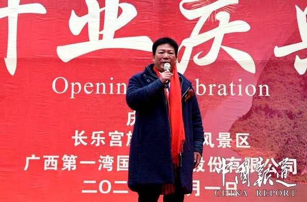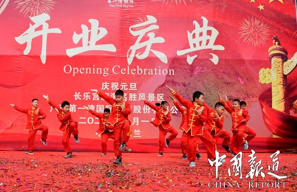 据主持人欧桑介绍,广西第一湾股旅游份公司在中共东兰县委、县人民政府的关怀下,经过几年的建设,中外关注的天下奇观长乐宫旅游景区基本完成阶段性任务,达到开放条件,决定于2021年1月1日也就是今天正式对游客开放。长乐宫岩溶地质形成于八亿年前,长乐宫旅游名胜风景区位于广西东兰县长乐镇板登村虎头山腰,邻近巴马县,凤山县,全程高速和二级公路,是以溶洞、峡谷、石瀑布、古生物化石等地质遗迹景观为主体,辅以丰富的生态景观和人文景观,集科学和美学价值于一-体的大型综合性地质公园,是广西首个花园式景区,中国第一个宫殿式民族景区典范。景区内把旅游、探险、仿古、穿越、祷佛、休闲汇于一体。洞内是仙境、洞外是花园,长乐宫名胜风景区堪称世界第一宫景区。长乐宫是一块宝山福地,今天我们也想在这里借长乐宫开业之际祝福我们伟大的祖国,祝福祖国繁荣昌盛、人民幸福安康。全体起立,升国旗,唱国歌,祝福祖国。