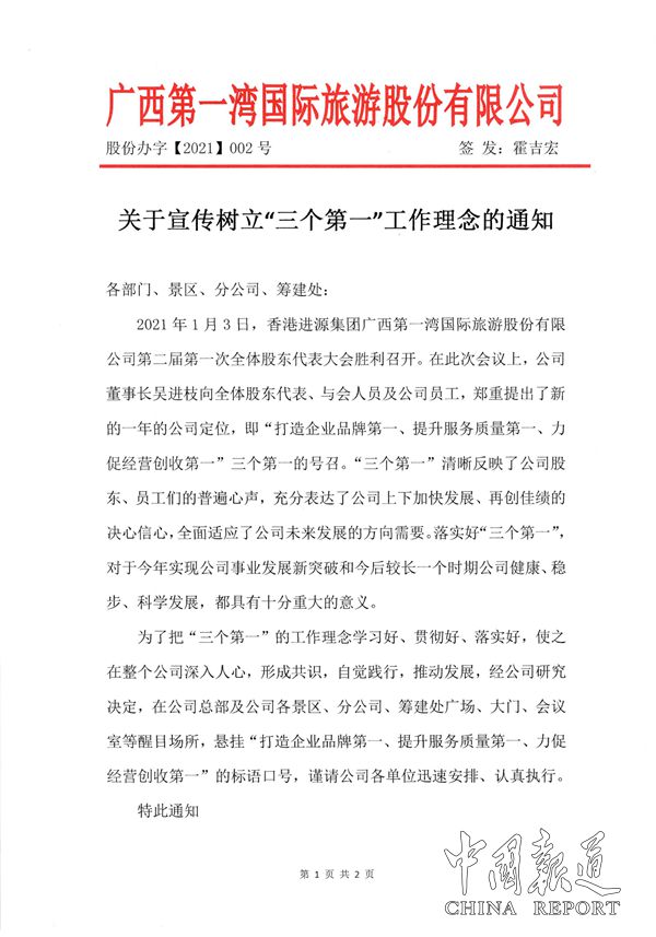 中国报道讯(通讯员覃源)2021年1月3日,香港进源集团广西第一湾国际旅游股份有限公司第二届第一次全体股东代表大会胜利召开。