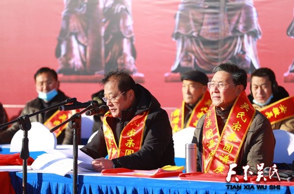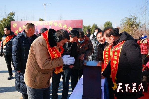 接着,神明爽俊、跨入花甲之年的庆典总指挥兼主持、原南京军区某总站的吴正龙贤达,字正腔圆顿挫有致、宽厚宏亮的声音在庆典会场上空回荡。在正龙贤达的主持下,大会在雄壮的《中华人民共和国国歌》声中拉开序幕。伴随着“天下吴氏一家亲”的优雅旋律,数百名族人在凛冽的寒风中虔诚的分别向泰伯、仲雍、季札三公仪像和族谱行祭拜大礼。