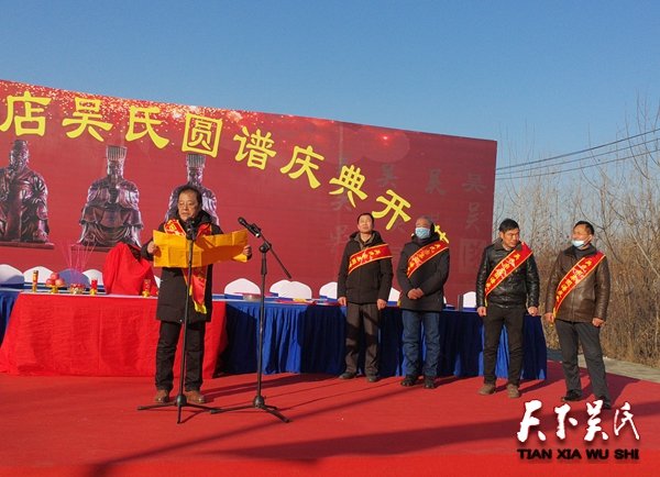 吴店吴氏修谱委员会的吴家智先生代表修谱委员会作了发言。他说“我们同宗共祖,随着各支系繁衍,凸显出我们继承先祖遗志的重要性和必要性······本次修谱,承蒙十二世正兵、十三世家华、十四世吴周等的鼎力支持,对本谱刊印提供了资金保障,最终才得到今天的成果。这也充分说明我们是一个团结的大家族!这次修谱,我们增加电子文本宗谱,所有资料可供大家复制,永久备份,有了现代科技的保障,宗谱不会像以前那样轻易遗失,我们这部宝贵的文献将会得到最好的传承和发扬”。