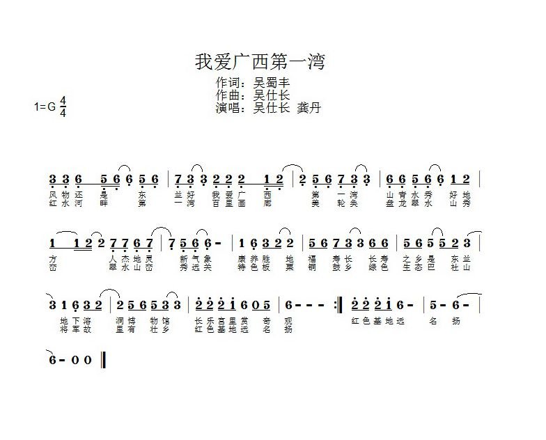 《我爱广西第一湾》由国家一级词曲作家吴仕长谱曲等人演唱,目前歌MTV正在进行后期制作中。