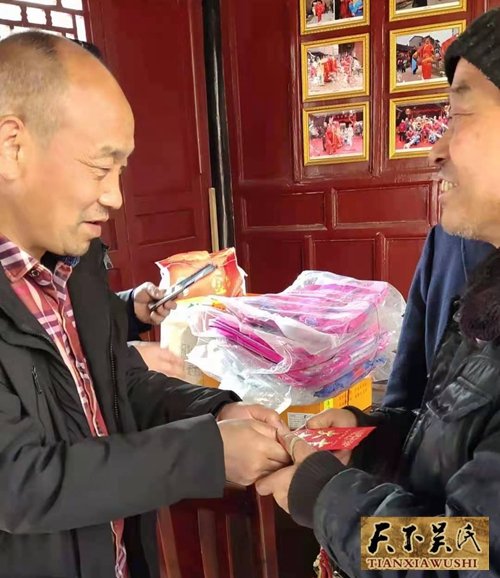 吴天智一行还给近70岁的吴金元宗长送去了节日的慰问品和慰问金以及世吴书刊等物,总会副会长,中国著名画家吴大华还专门赠送了一幅自己的作品以示勉励。