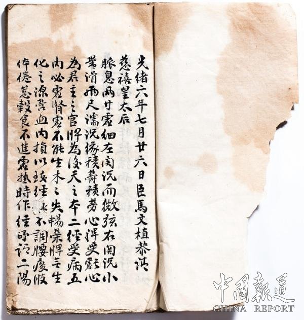 农历七月二十六日臣马培之恭请慈禧皇太后脉息,两寸虚细,左关沉而微弦。右关沉,小带滑,而二尺沉濡,缘积郁积劳、心脾受亏。心为君主之宫,脾为后天之体;两径受病,五内必虚,不能生木。本失畅荣,脾乏生化之源,荣血内损,以致经脉内调,腰酸、肢体倦怠,谷食不甘,寒热时作,经:所谓二阳之病发心脾是也。谨拟养心调脾之剂进呈。