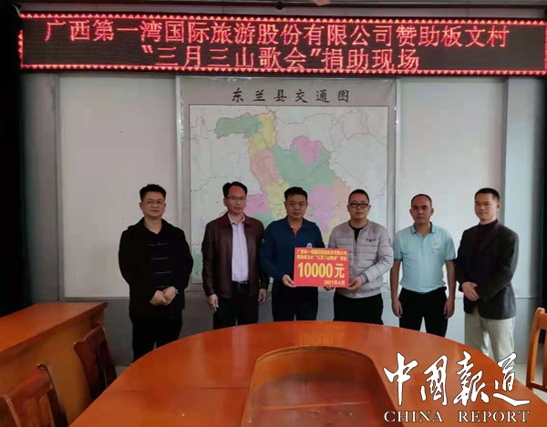 4月12日上午,广西第一湾国际旅游股份公司董事长吴进枝委托景区副总经理陈胜乾、景区游客中心主任王景珍两人将一万元的资助金送至镇政府,亲自交到板文村党支部书记、村民委主任何世宁手中。捐助现场会上,何世宁党支书双手接过资助金,并诚恳邀请第一湾公司领导届时到现场参加“‘感党恩、跟党走’广西三月三山歌会主题活动”。捐助现场出席的有三石镇人民政府镇长牙东江、副镇长韦华、镇武装部长韦庆华。镇长牙东江代表镇政府、板文村群众向公司表示衷心的感谢,同时预祝板文村“广西三月三山歌会”活动圆满成功。