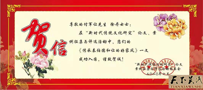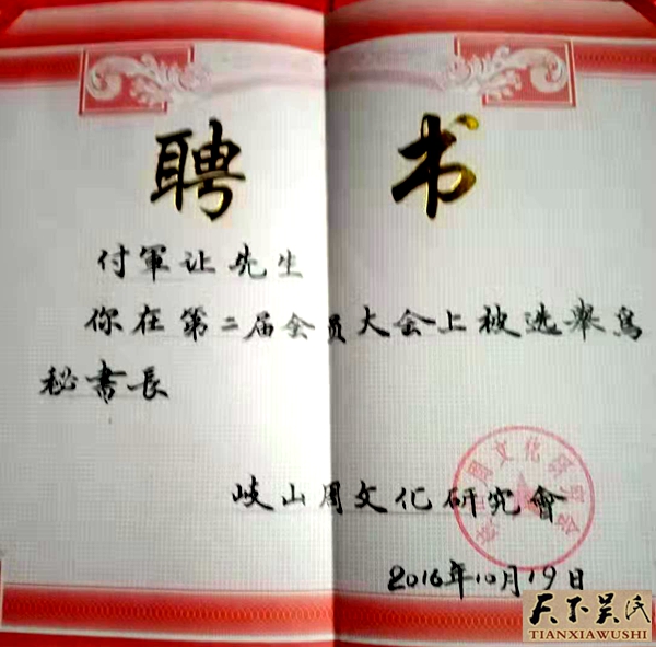 为了挖掘泰伯至德思想的根源,弘扬泰伯文化,付军让、徐丹通过在陕西省人民政府立碑保护的东坡遗址、泰伯生活过的岐山岐周王城东坡村实地调研,多学科学习,联系实际联袂撰写了巜古公亶父  英明领袖》的论文。该论文重点剖析了周太王在岐山脚下建立周原,发展壮大的历史进程及泰伯奔吴的历史原因,欢迎泰伯后裔到岐山东坡寻根问祖,祭祀泰伯。论文受到了大会组委会的高度关注,论文被收录到了全国泰伯论坛理事会、第五届全国泰伯论坛文集编辑委员会巜泰伯论坛文集》,获得了论坛优秀论文,上台领了奖。付军让先生、徐丹女士受到大会论坛的表彰奖励。无锡市人民政府原副市长吴建道亲手在台上给付军让先生颁发了荣誉证书。世界吴文化研究会会长、厦门吴文化研究会会长吴国荣博士,在这才论坛上亲笔挥毫,为付军让先生主编的《付军让周礼文化108 讲》题写了书名。