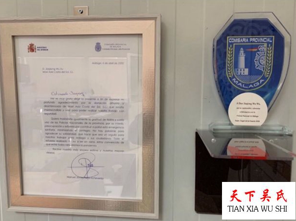 西班牙马拉加省警察署长签发感谢信!信中有几段话说:“在今年疫情最严峻时,防疫物资严重紧缺,导致全省警员无法在安全的环境下工作,您(吴佳琼)以及贵公司雪中送炭,无私奉献、善举、爱心,捐赠大量防疫物资,避免了数千警员不受病毒感染,功德无量,情重泰山”!“没有言语能够表达全省警员对您们的感激之情,为马拉加省的市民服务,我们感到非常自豪”!“请允许我(省警察署署长)代表马拉加全省警察群体向您们致以最衷心的感谢!大家的努力不会白费,我们终究会战胜病毒”!