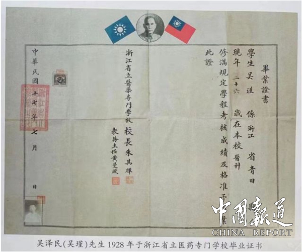 中国报道讯(通讯员吴靖年)吴泽民,学名吴瑾,字泽民,号玉村,湖云村人,10 岁 就读私塾,16 岁(1918 年)转入青田县敬业小学就读;18 岁(1920 年)秋考入处州(今丽水)省立师范学校学习,次年(1921 年)转入省立第十一中学(处州中学)就读。每次上学,从湖云村沿山路步行经石马垟、城门垟乘渡船过渡到对岸城门村,再走山路经驮垄、旺谢(王谢)、折下西源口至高市村的山岭行程 30 华里,在高市姑妈(陈诚将军的元配夫人吴舜莲)家过夜,第二天步行 90 华里到达丽水处州中学就读;22 岁(1924 年)处州中学毕业,考入浙江省立医药专门学校(浙江医科大学前身)就读;26 岁(1928 年),2 浙江省立医药专门学校毕业。胸怀革命理想和热情,经三叔海军中将署长吴子漪举荐,赴汉口报名参加国民革命军后方医院,任上尉军医;27 岁(1929 年)蒋桂战争爆发,桂系失败,后方医院解散,吴泽民回到故乡青田。