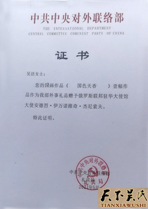 2021年5月国画牡丹《国色天香》被中共中央对外联络部作为外事礼品赠予俄罗斯驻华大使馆大使安德烈·伊万诺维奇·杰尼索夫。现任湖北省黄冈市慈善组织负责人。
