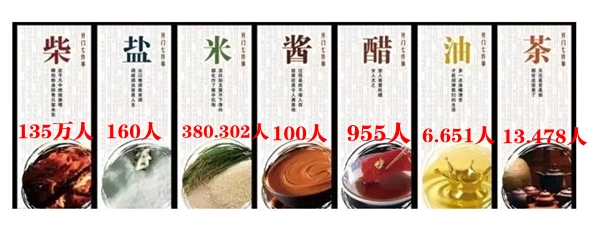 2006年《国家地理杂志》调查:柴米油盐酱醋茶都是姓,柴姓130多万酱姓不足百人。生活用品系列姓氏统计数据:柴 1350,463米 380,302油 6,651盐 168酱 少于100人醋 955茶 13,478。