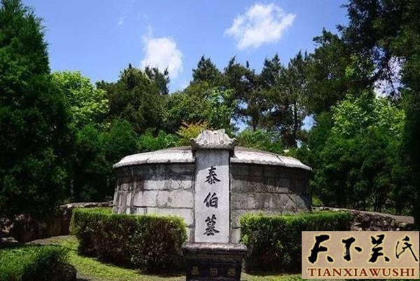 泰伯享寿91岁,死后葬于鸿山。泰伯墓又称吴王墩,于东汉永兴二年(154)敕建,宋哲宗御书“至德墓道”,清乾隆帝御书“三让高踪”匾。经历代帝王修葺,泰伯墓至唐代盛世时最为宏伟壮观,堪称“江南第一古墓”。后于1999年、2006年整修,再现“江南第一古墓”之历史风貌。2006年更名为泰伯陵,并被国务院列入全国重点文物保护单位。泰伯墓是青石砌封土墓冢,如《弘治无锡县志》所载,“泰伯墓在鸿山,冢高一丈四尺,周三十五步”。墓前立有装饰云龙纹、火珠线雕图案的青石碑一座,刻阴文楷书“泰伯墓”。前方竖有望柱一对,柱顶刻护陵蹲狮一对。在墓附近,尚存照池、棂星门、四棱碑、泰伯享堂等明清时期建筑。