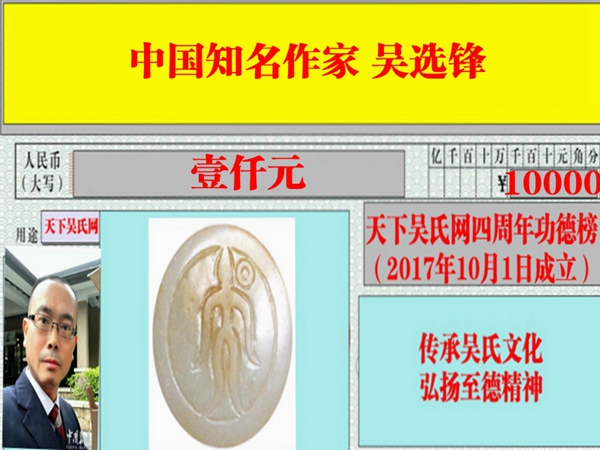 中国知名作家吴选锋赞助天下吴氏网壹仟元