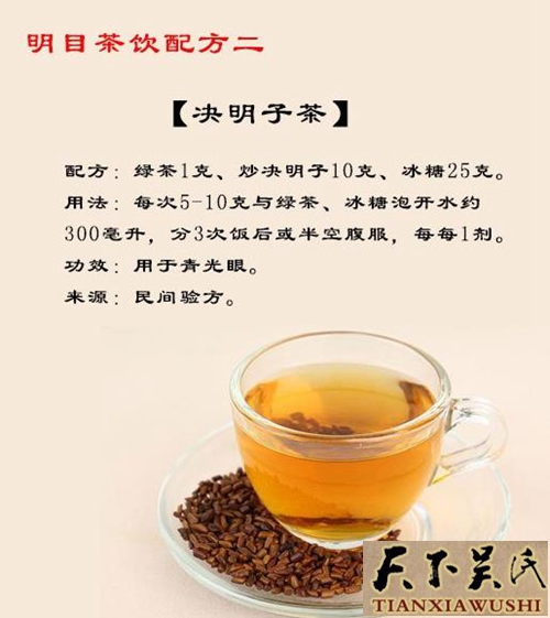 决明子又称“还瞳子”,决明子含有多种维生素和丰富的氨基酸、脂肪、碳水化合物等,其保健功能日益受到人们的重视。决明子具有清肝火、祛风湿、益肾明目等功能,常饮决明子茶,可使血压正常,大便通畅,老眼不花。临床实验证明,喝决明子茶可以清肝明目、防止视力模糊、降血压、降血脂、减少胆固醇等,对于防治冠心病、高血压都有不错的疗效;而且决明子富含维生素A及锌,可防治夜盲症以及避免小儿缺锌。此外,决明子茶润肠通便的功能也能解决现代人肠胃及便秘的问题,可以治疗大便燥结,帮助顺利排便。决明子茶的泡法十分简单,只要用15~20克决明子用热开水冲泡即可,也可依个人喜好放入适量的糖,当茶饮用,每日数次,若能配上枸杞子及菊花,效果更佳。