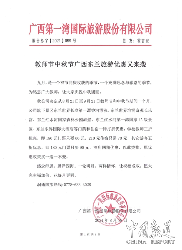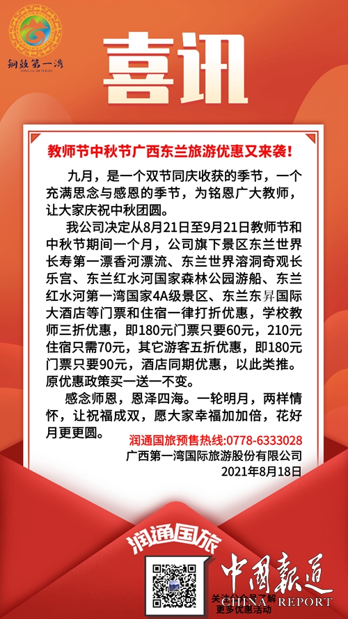 广西第一湾国际旅游股份有限公司从8月21日至9月21日教师节和中秋节期间一个月,公司旗下景区东兰世界长寿第一漂香河漂流、东兰世界溶洞奇观长乐宫、东兰红水河国家森林公园游船、东兰红水河第一湾国家4A级景区、东兰东昇国际大酒店等门票和住宿一律打折优惠,学校教师三折优惠,即180元门票只要60元,210元住宿只需70元,其它游客五折优惠,即180元门票只要90元,酒店同期优惠,以此类推。原优惠政策买一送一不变。