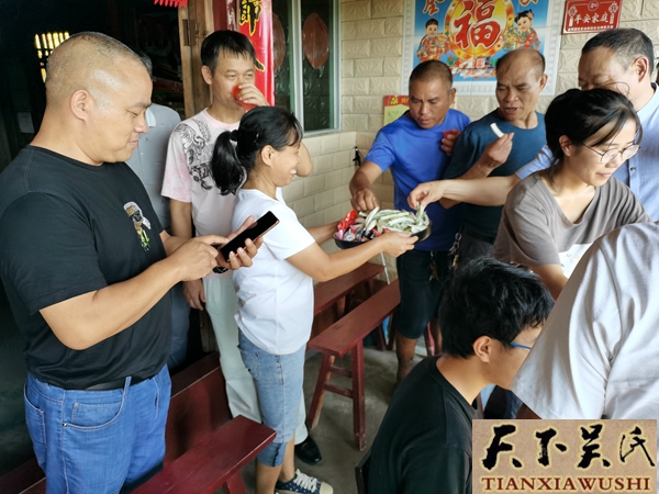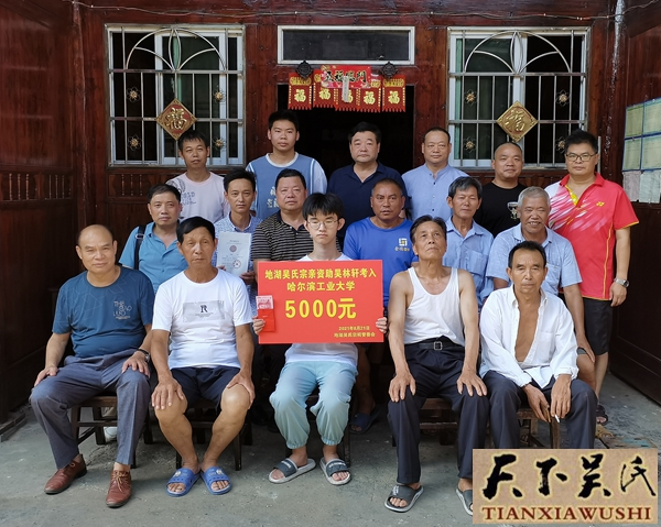 天下吴氏网讯(贵州站报道吴厚征吴宜辉)莘莘学子梦,浓浓助学情。8月21日,在湘黔寨老的带领下,20多位爱心人士代表到贵州省天柱县地湖乡江口村吴林轩、永兴村吴林锋、永光村吴莉和湖南省会同县地灵乡团结村吴灿家中,恭贺4位农村学子分别考入国家级重点院校哈尔滨工业大学、武汉理工大学、贵州大学、西南交通大学,给每个家庭奖励5000元现金,帮助他们到大学深造。每到一处,家长们高兴地拿出蜜饯、茶等当地特产招待爱心人士,并鞠躬表示感谢,之后在堂屋前合影留念。