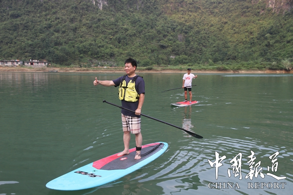2020年9月4日,国际救援协会广东省中山市浆板冲浪团队来到广西东兰县坡豪湖国家湿地公园和和水河第一湾进行水上滑行,首次将世界锦标赛项目浆板冲浪亮相东兰红水河,东兰县独特的水资源,得到充分肯定。
