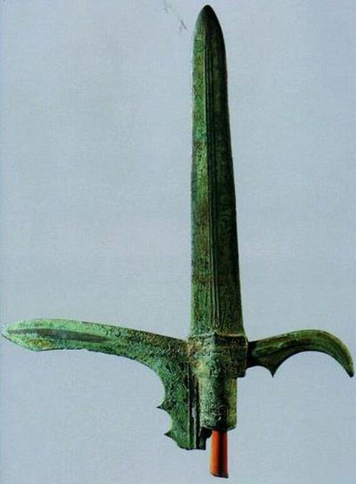 夫差铍 春秋时期后期。刺击兵器。器身与剑身相似而稍短,中线起脊,脊上有血槽,两面血槽后端各铸一兽首。骹中空,骹口扁园。通体满是菱形几何暗纹。基部有错金铭文两行八字,记器为吴王夫差自做。冶铸精良,花纹优雅,保存完好可与越王勾践剑媲美。1983年湖北江陵马山出土。现藏湖北省博物馆。