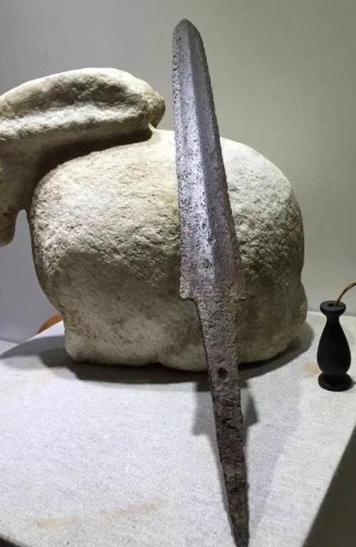 吴王夫差剑 其一出土于湖北襄阳蔡坡12号墓中,剑首残缺,剑柄为圆筒形,剑锋锷已腐蚀.残长37厘米、宽3.5厘米,配有漆木鞘,剑身铸有篆书阴文二行10字:“攻玫(敔)王夫差自乍其元用”,出土时剑在鞘内。其二出土于河南辉县东南的战国墓区,剑身宽5厘米,全长59.1厘米,满布花纹,锋锷仍很锐利。剑身铸有篆书阴文10字:“攻痦王夫差自乍其元用”两剑刻字的内容相似。