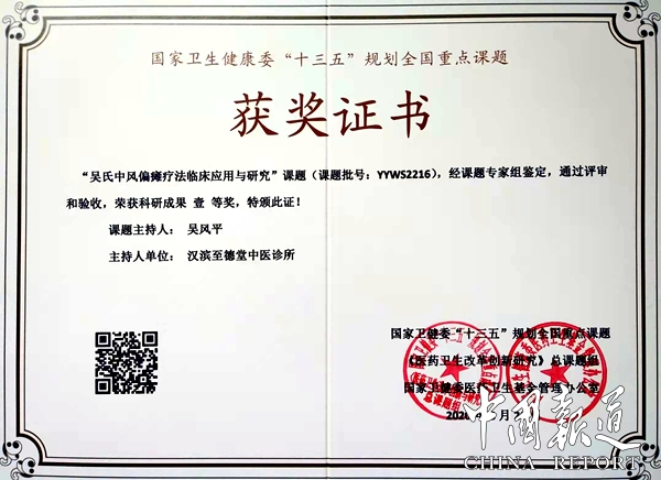 此外,经过专家评审,《吴氏中风偏瘫疗法临床应用研究》课题荣获国家卫健委“十三五”全国重点课题科研成果一等奖!
