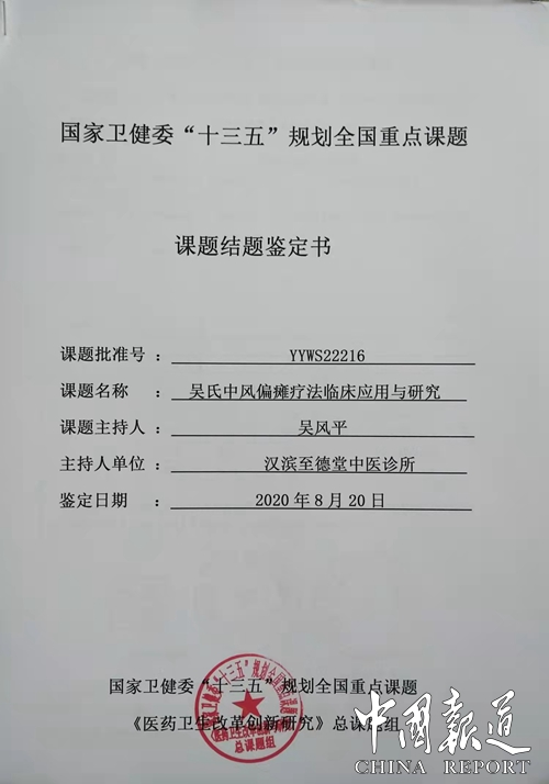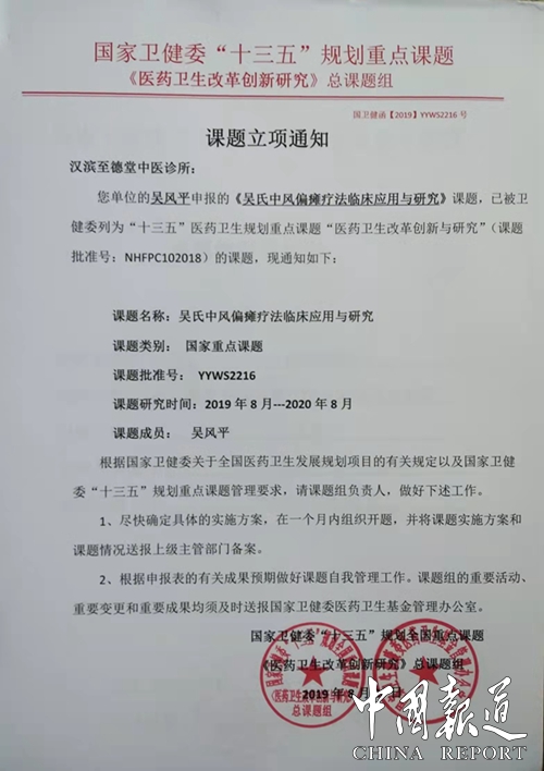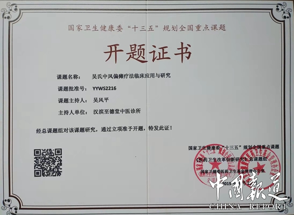 中国报道讯(吴蜀丰 报道)由陕西安康市至德堂中医诊所申报的《吴氏中风偏瘫疗法临床应用研究》课题,近日经过国家卫健委“十三五”规划重点课题《医药卫生改革创新与研究》总课题专家评审组的严格审核,被列入国家卫健委“十三五”规划重点课题“医药卫生改革创新与研究”决定立项,课题批准号:YYW52216。并且聘请至德堂中医诊所吴风平教授为“吴氏中风偏瘫疗法临床应用研究”课题负责人。据了解,该课题经过长达一年时间严格评审即2019年8月20日至2020年8月。