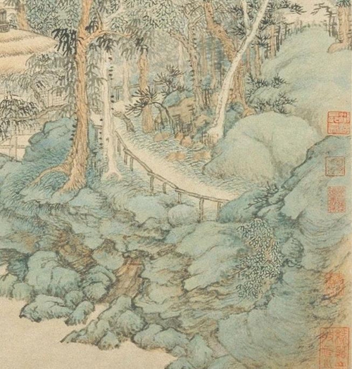 吴历流传下来的作品较多。仅上海博物馆收藏书画就达32幅,含五、六个大幅精品佳作,如《雨歇遥天图》《葑溪会琴图》《槐策堂图》等。北京故宫博物院更是收藏丰厚,如43岁时作的《松壑鸣琴图轴》取法王蒙,景色郁茂,布局深远,皴法细密,积墨厚重,阴面多用重墨,受光部分作“阳面皴”,增强了山石的立体感,反映了画家成熟后的典型风格。75岁作的《黄山晴蔼图卷》,仿王蒙,更具沉郁之气,山石用干笔织墨层层加皴,并用焦墨点擦,阴阳阴晴分明,苍郁滋润。75岁作的《泉声松色图轴》,是仿黄公望,皴法繁密,笔力雄浑。这些仿名家的晚年之笔,均具浑厚凝重之特色。