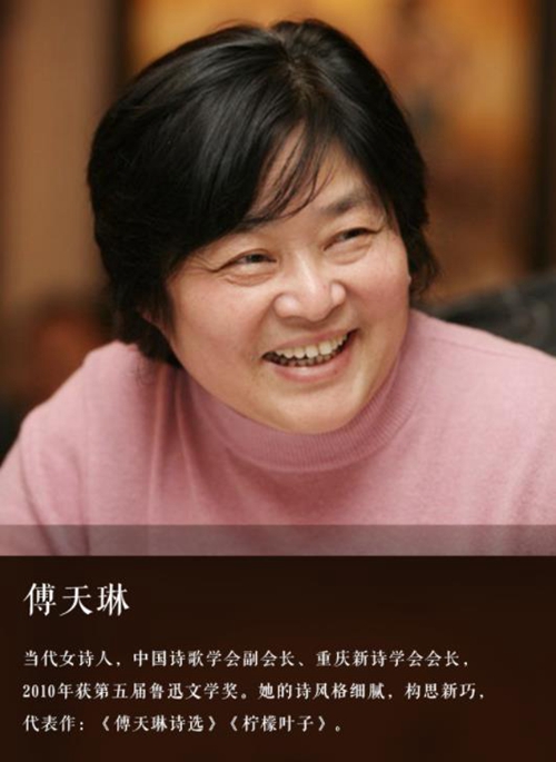傅天琳(1946年1月24日—2021年10月23日),生于四川省资中县,中国著名诗人、中国作家协会会员、中国诗歌学会原副会长、重庆市作家协会荣誉副主席、重庆新诗学会会长、《银河系》诗刊主编、重庆出版社编审、全国新诗(诗集)奖及鲁迅文学奖诗歌奖获得者。先后在《红岩》、《四川文学》、《星星》、《诗刊》、《人民文学》、《上海文学》等全国各地刊物上发表诗作。她的诗风格细腻,构思新巧。诗集有《绿色的音符》(1981年,四川人民出版社;获中国作家协会第一届“1979—1982”全国新诗二等奖),《在孩子和世界之间》(1983年,重庆出版社)。