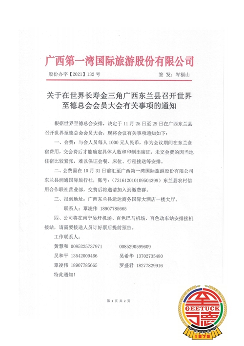 广西第一湾公司今年烛家担任负责11月28日世界至德总会在东兰召开,欢迎你们参加至德大会并支持第一湾公司的工作,会费缴费1000元/人,交费后邀请到出席群并为您办理食宿接机等手续!