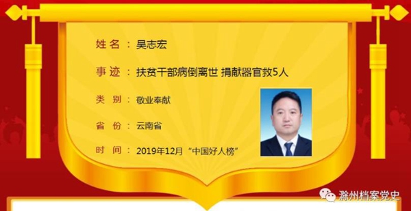 吴志宏,1992年参加地方志工作,2018年3月担任红河县三村乡党委副书记、三村乡驻村扶贫工作队长兼补干村第一书记、工作队队长。2019年10月17日在补干村委会南哈上寨扶贫对象动态管理公开评议会上突发疾病,于2019年11月8日不幸去世,终年49岁。他是坚守初心使命、敢于担当作为的共产党员典型,是修志问道、直笔著史的方志标杆,是大公无私、一心为民的干部楷模。他干一行爱一行,钻一行精一行,大学一毕业即到红河州地方志办公室工作,27年如一日铁心修志编鉴,成果丰硕、质量过硬,为红河州地方志事业发展作出了重要贡献。他先后4次到基层挂职或任职,积极参与社会主义新农村建设。2018年到红河县三村乡驻村扶贫以来,夜以继日,全身心奋战在扶贫一线,直到生命最后一刻。他牺牲后,家人遵从其遗愿,将其器官进行捐赠,使5名患者重获新生。