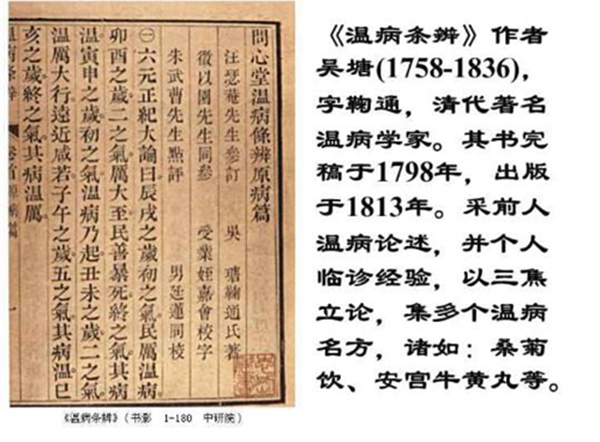 吴鞠通谓前贤之中,元代王履(安道)虽能辨证温病,但论之未详;明末吴又可区分伤寒、温病,但立法欠精纯;清代叶天士立论精细,但立法甚简,皆未能透达圆满。于是吴氏取诸贤精妙,考之《内经》,参以个人心得,统论温病,而成此书。《温病条辨》由问心堂初刊于嘉庆十八年(1813年),此后翻印、增批评注近百次。《温病条辨》有多种现代校点本,以道光十六年(1836年)刊本为底本,2007年张志斌以嘉庆十八年(1813年)问心堂初刊本为底本校点出版,收入《温病大成》一书。吴瑭(1758—1836),字鞠通,淮阴(今属江苏)人。19岁时其父因病而死,伤痛之余,遂广购方书。研读中见张仲景《伤寒论》序中有“外连荣势,内忘身命”之论,因慨然弃举子业,专事医术。4年后,其侄子病温,随后死于发黄,这一刺激更坚定了吴氏研究温病的决心。又过了3年,吴瑭至京师,检校《四库全书》,得览明季吴又可《温疫论》,于是专心于温病诊治。经过10年的钻研,吴氏已有很多心得,但从未敢轻易治疗一人。乾隆五十八年(1793年),北京温疫大行,吴瑭才一展身手,救治了数十人。长期的阅读积累,又经过成功的临床实践,吴瑭开始著书立说。嘉庆三年(1798年),吴氏将书初步完成。直到嘉庆甲子年(1804年),吴氏将此书展示给友人徵保。再经过10年,书终告完成,并刊于嘉庆十八年(1813年)。
