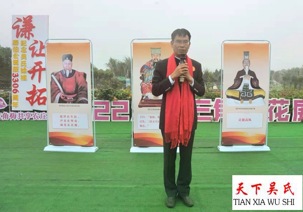 三角梅共享农庄庄主,海口市吴贤秀文化研究会会长吴林桥致欢迎词,各市县宗亲会的代表发表感言。纪念活动,特别邀请世界至德总会传统文化宣讲团团长李海波老师做了“谦让开拓永利苍生,和平发展共谋大同”的历史文化讲座。讲述了泰伯公的至德精神,弘扬至德文化的重要性。
