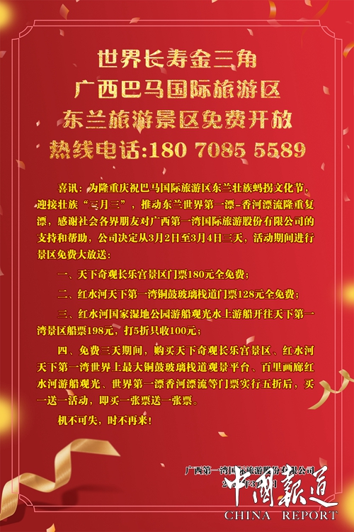 中国报道讯(通讯员 岑福山)喜讯:为隆重庆祝巴马国际旅游区东兰壮族蚂拐文化节,迎接壮族“三月三”,推动东兰世界第一漂◎香河漂流农历三月三隆重复漂,感谢社会各界朋友对广西第一湾国际旅游股份有限公司的支持和帮助,公司决定从3月2日起至3月4日止共三天,三天的活动期间进行景区免费大放送:
