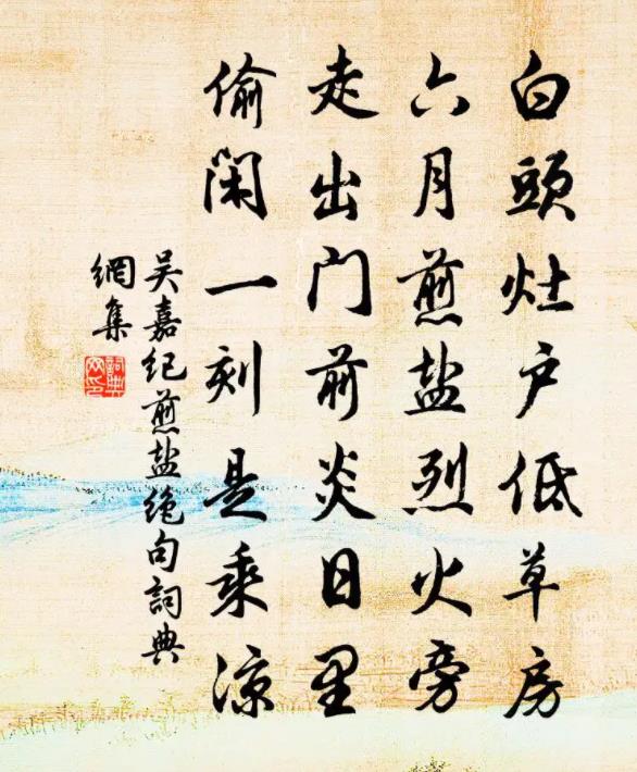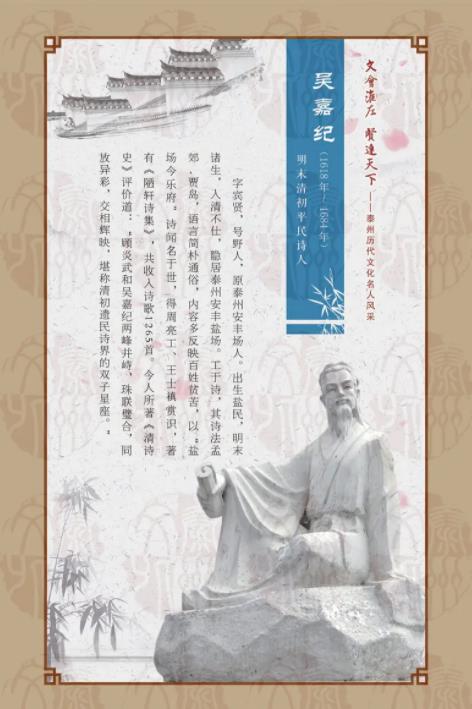 吴嘉纪(1618-1684),字宾贤,号野人,江苏省东台市安丰镇人即泰州安丰场,以“盐场今乐府”诗闻名于世。出生盐民,儿时多病,明末诸生,入清不仕,隐居泰州安丰盐场。工于诗,其诗语言简朴通俗,内容多反映百姓贫苦,颇有孟郊﹑贾岛的诗风,得到周亮工、王士禛赏识。著有《陋轩诗集》,共收入诗歌1265首。上海古籍出版社有《吴嘉纪诗笺校》本。