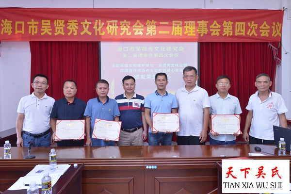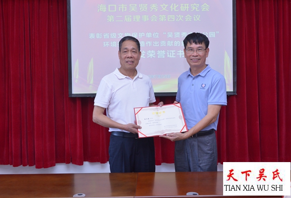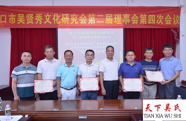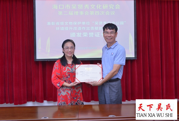 会议特别表彰了在海南省级文物保护单位“吴贤秀文化公园”提升修缮改造中做出贡献的爱心宗亲,他们颁发荣誉证书以示鼓励!会议一致通过海口市吴贤秀文化研究会2021年财务报告。