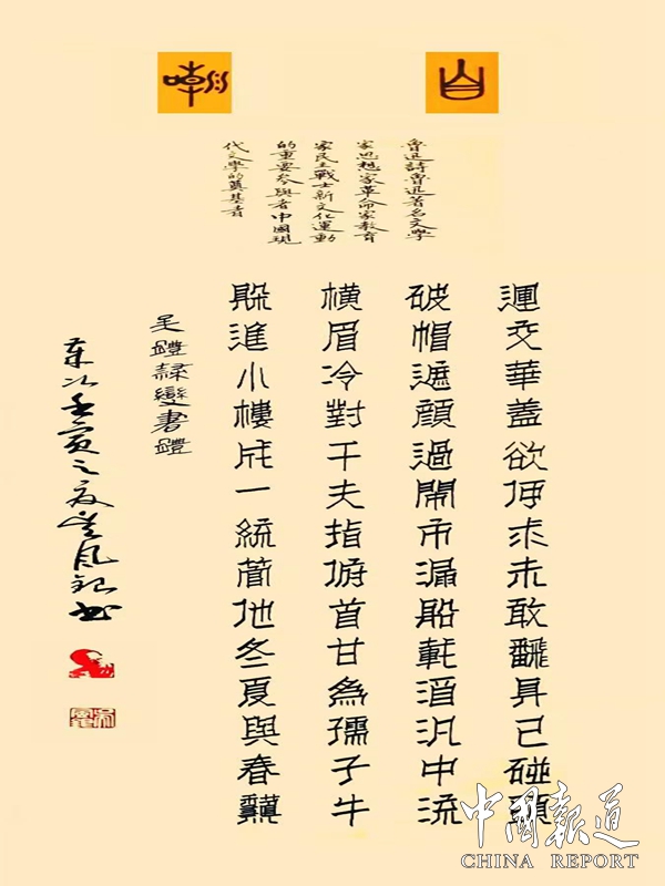 中国报道讯(吴蜀丰报道)吴风银,又名吴凤银,斋号疯人斋主、疯爷堂主。笔名金艮。1956年出生,黑龙江省大庆市人。深圳国学与吴文化书法院院长。中国当代实力派书法家。中国书法家协会会员,黑龙江省书法家协会会员,中国石油作家协会会员。独创了两种新奇唯美、独树一帜的书法书体“吴体隶书”和“吴体隶变”,并亲自编纂出版了《吴体隶书吴体隶变书法字典》。其书法作品被国内外友人和藏家收藏。