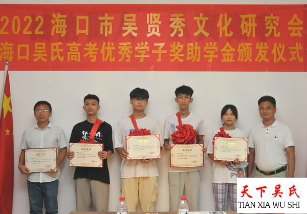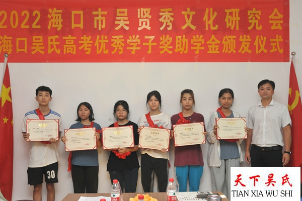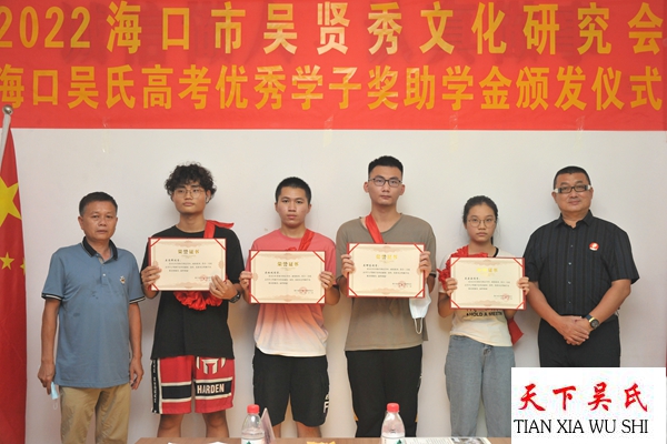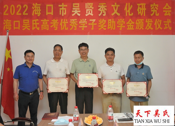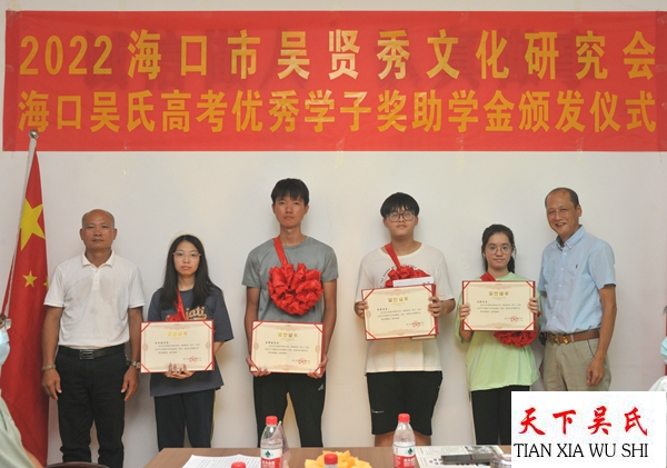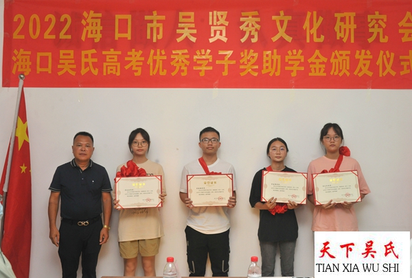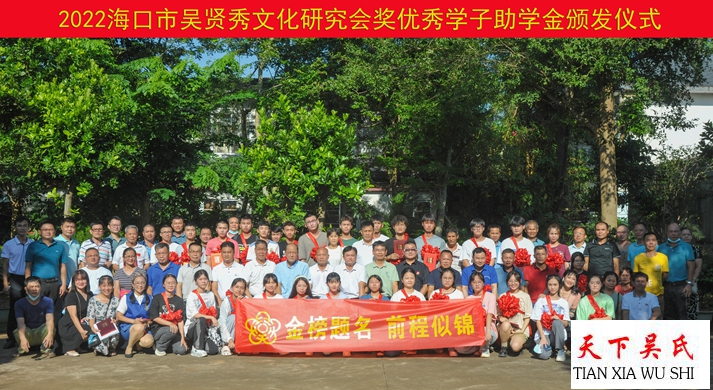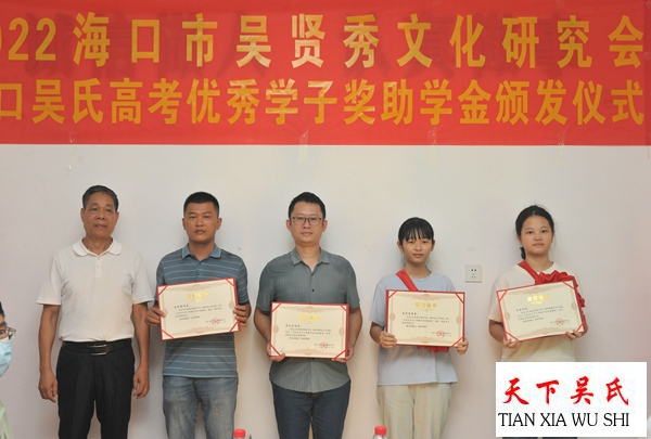 天下吴氏网讯(海南工作站吴乾山报道)8月23日,一年一度的海口市吴贤秀文化研究会“奖助学金”颁发仪式在海南花卉大世界举行。在热心公益,关心教肓的各位吴氏爱心人士的大力支持下,对符合《吴氏高考学子奖助学金申请通知》条件的优秀学子进行奖励。