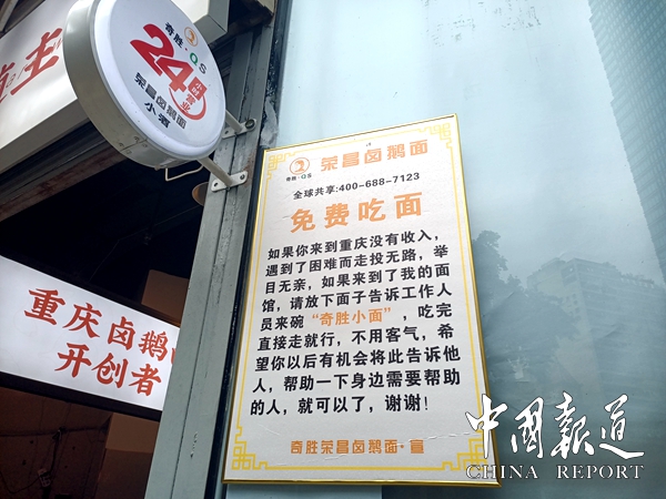 郑国军最后承诺说:“常言道,在家千日好,出门经常难。出门在外谁都会遇上不尽人意事,哪怕身无半文,只要来店里均可免费吃一碗奇胜小面。”这也是郑国军的善举。门上还挂了一块的“免费吃面”的醒目招牌。