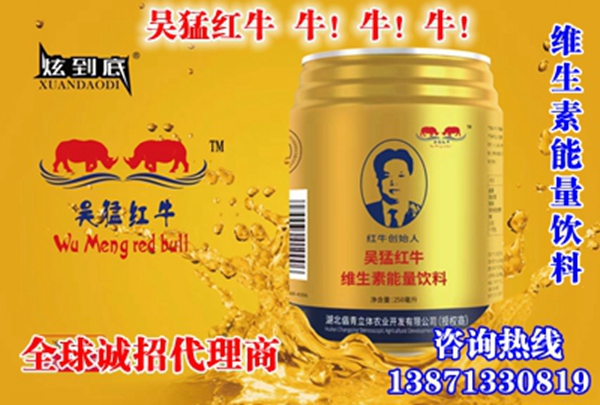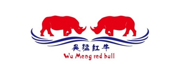 关于商标含义:商标分为上中下三,上为图案,两头犀牛在一起喝水,寓意和平、健康、财富与共享理念。犀牛看不到尾巴,取中庸之道,中国人喜欢低调做人,谨慎处事。中间为中文:吴猛红牛,中国品牌。下为英文:WuMeng red bull,吴猛红牛要把和平、健康、财富与共享传播到全世界。