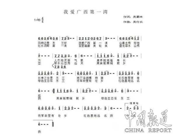 由作家吴蜀丰作词,国家一级词曲家吴仕长谱曲演唱的《我爱广西第一湾》5月24日分别在QQ音乐、酷狗音乐、酷我音乐,全国各大KTV点歌平台成功上架,全网发行。《我爱广西第一湾》唱出了神奇壮美的第一湾景色,唱出了广西第一湾和东兰红色景区的激情。《我爱广西第一湾》MTV画面展示了广西第一湾在东兰县境内多个美丽风景区,让广大歌曲发烧友及旅游爱好者身临其境。