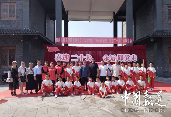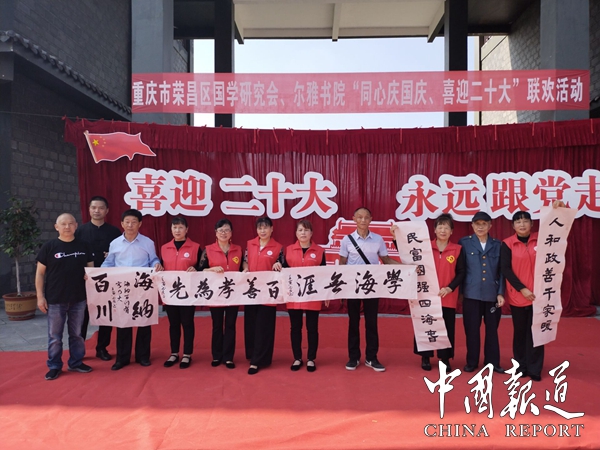 中国报道讯(吴蜀丰报道)9月30日,重庆市荣昌区国学研究会■尔雅书院在荣昌区万灵古镇万灵福邸广场开展了“同心庆国庆、喜迎二十大”联欢活动。本次活动由荣昌区文化和旅游发展委员会指导,荣昌区国学研究会主办,荣昌区国学研究会尔雅书院承办,重庆尔雅清风文化传媒有限公司,荣昌区知行社工服务中心,荣昌区学院路小学,荣昌区棠香小学,荣昌区高新区实验小学,荣昌区红苹果美德幼儿园,荣昌区苏家拳武馆,荣昌区腾达功夫搏击馆,重庆自然坊生态农业科技有限公司,重庆市荣昌区艺乡灯饰城为本次活动协办单位。