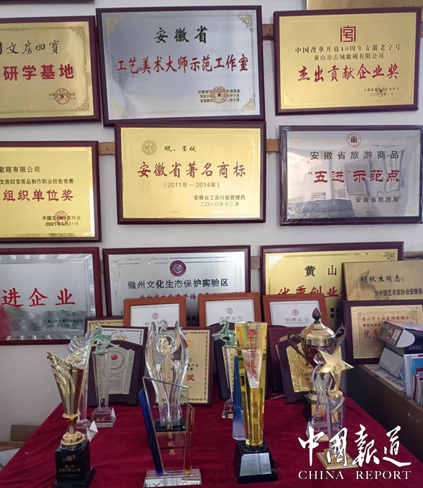 在我采访时,胡秋生接打多个电话,是为了落实县里要举办的一个非遗活动。他说,搞这样的活动,我有经验,那些外地名家我熟悉,应该把他们安排妥当,使活动顺利开展。是的,胡秋生有社会责任心,勇于担当,曾主动支持多个重大活动,如承办国家科技部“十二五”科技支撑项目子项目、承办四届“和氏璧”杯非遗(歙砚)技能大赛(荣获省市县四次特别贡献奖)、承办“徽州百工”大奖赛(荣获黄山市总工会特别贡献奖)、承办全国轻工行业职业技能竞赛——全国砚台雕刻工技能竞赛,等等。