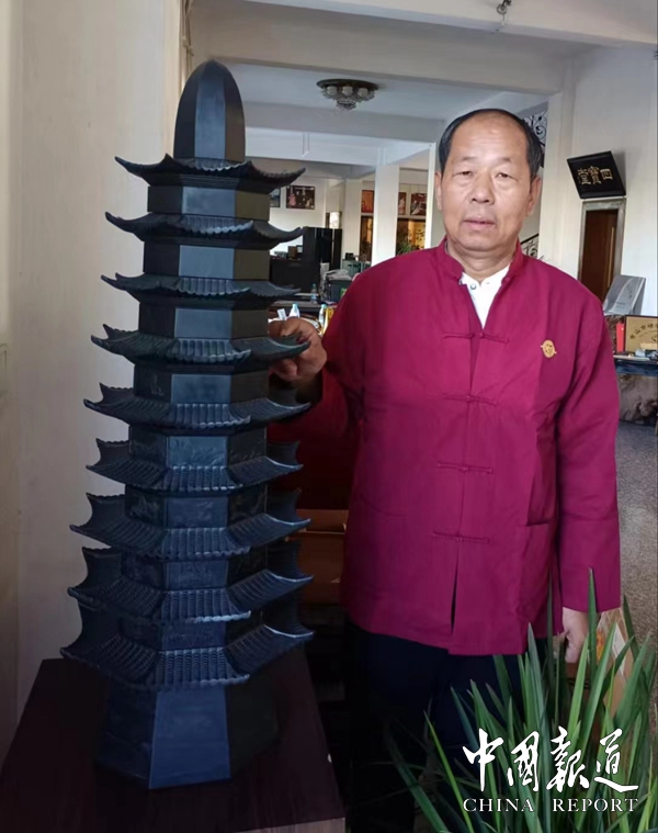 2019年起,他亲率四人,花费两年多时间,选取歙砚中的上品石材,雕刻了两座一模一样的“延安宝塔”,塔呈8角,共9层,由20方砚石、18方砚台组合而成,其上有30多幅精雕的图案,命名为《延安宝塔——峥嵘岁月·复兴之路》,全景呈现中国共产党百年历程,以向党的百年华诞献礼。此作品立意高远,主题鲜明,雕刻精细,受到多方面的肯定和赞扬。其中一座,已被国家非遗博物馆收藏。